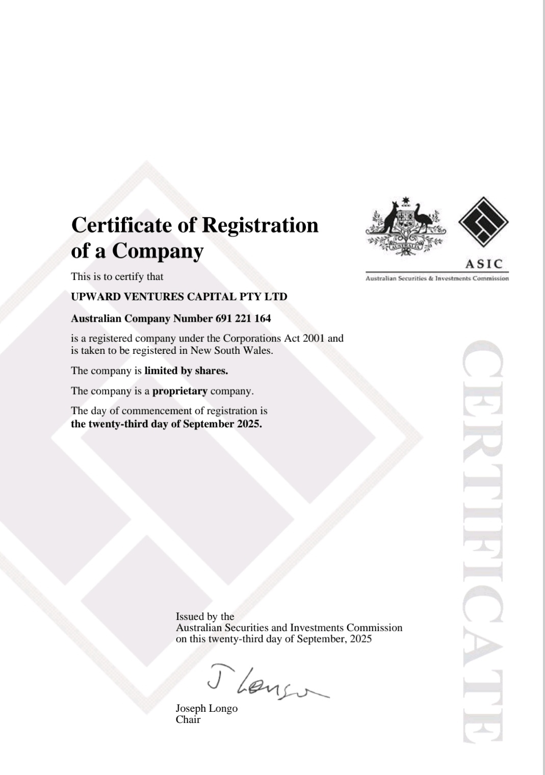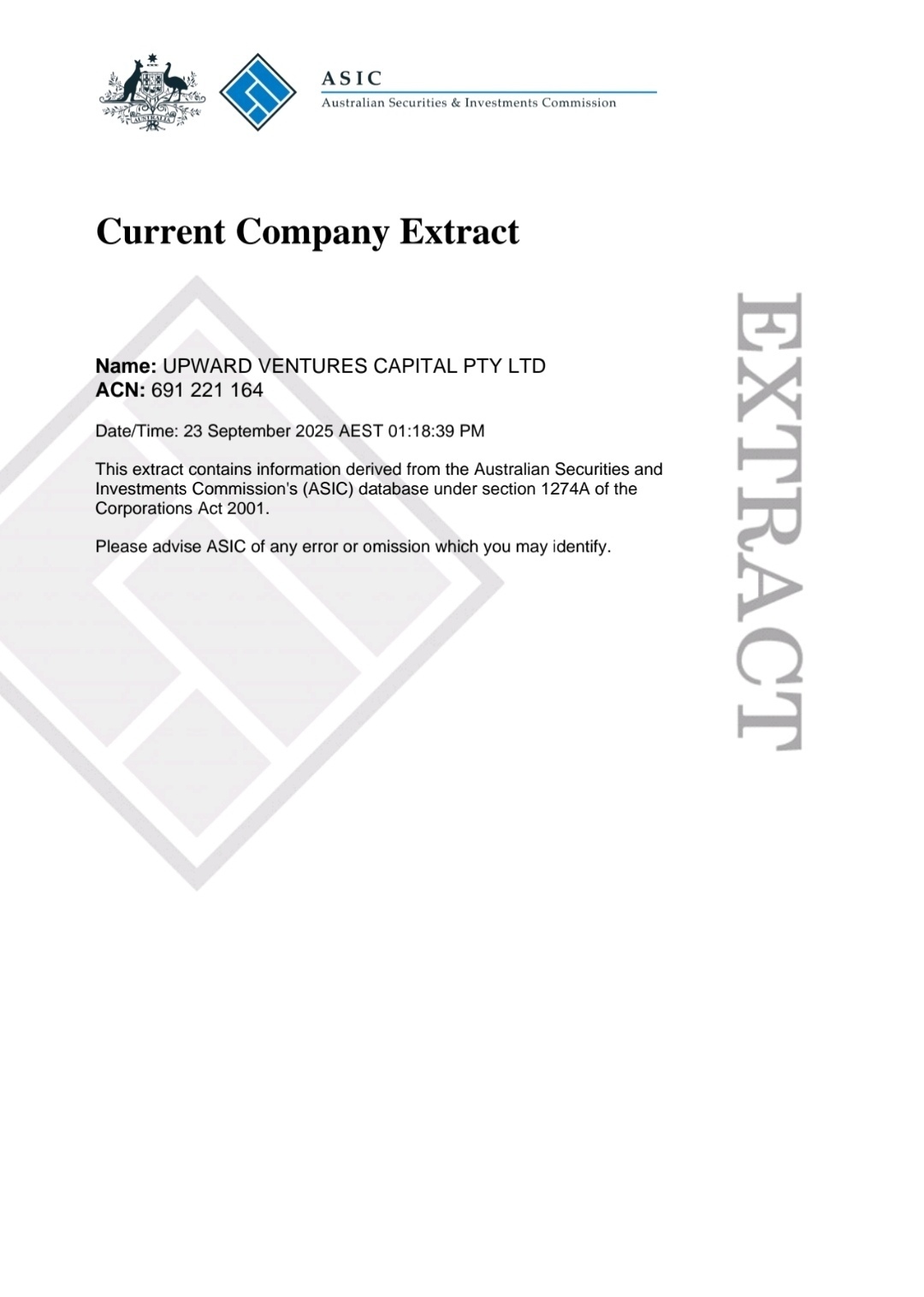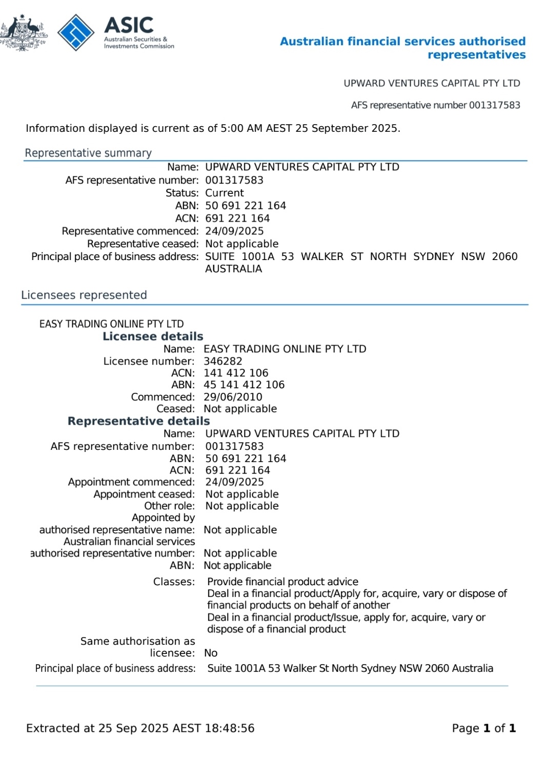 Upward Ventures Capital Pty Ltd is a registered financial services company with the Australian Securities and Investments Commission (ASIC). We are committed to providing clients with professional financial product advice and investment management services.